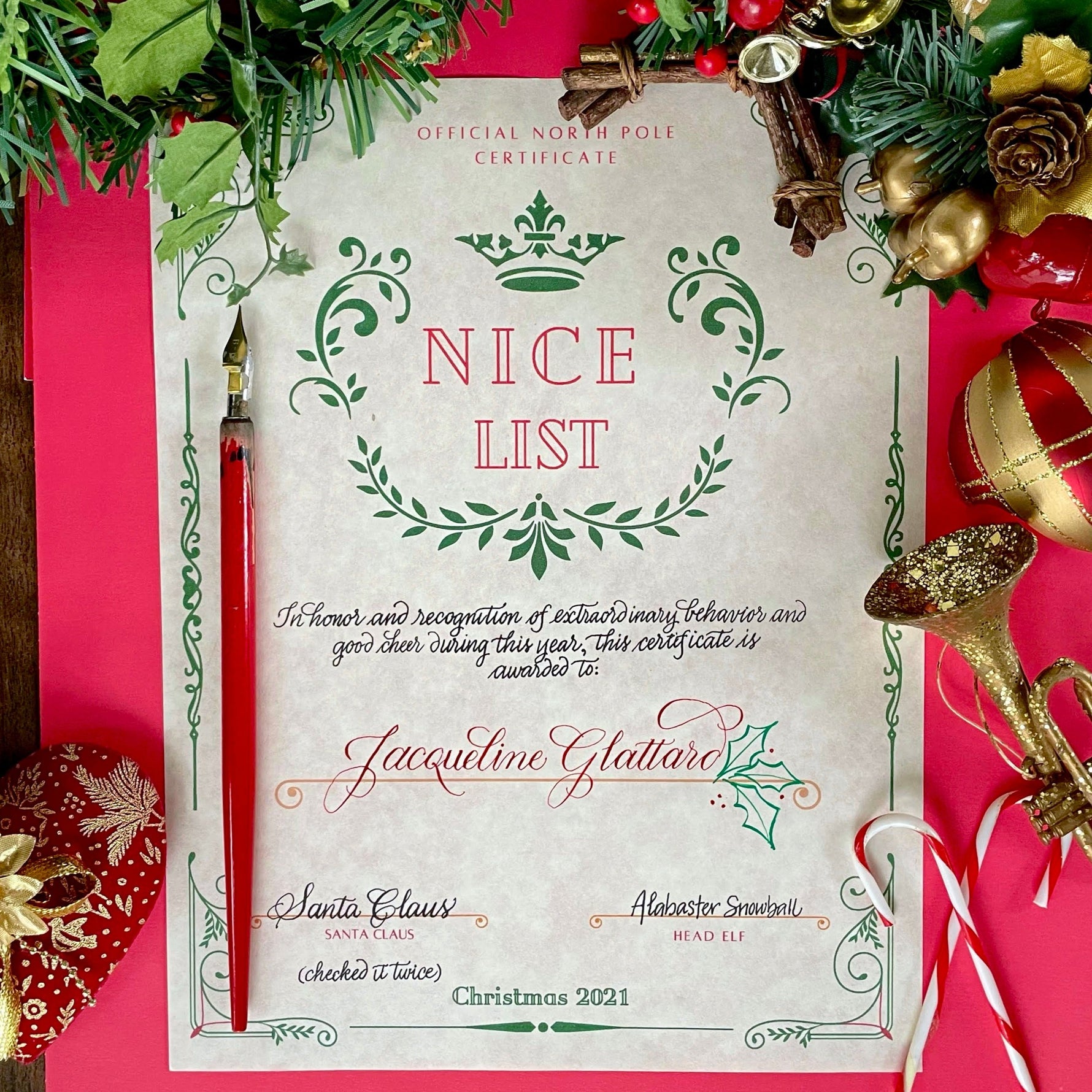 Unit price perKeep the magic of Christmas alive with an official hand lettered Nice Certificate, signed by Santa Claus and the head Elf.